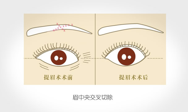 眉中央交叉切除:适合于眉外侧下垂,外眼角下移,外侧上睑皮肤松弛者,有些甚至出现三角眼;眉外侧有瘢痕,色素沉着,而眉头及眉中间位置及形态正常者。
