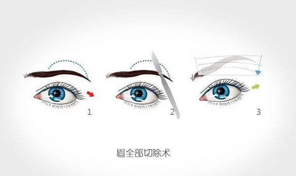 眉全部切除术:主要适用于整个眉部由于反复洗眉产生瘢痕,眉毛稀疏;纹眉后颜色(通常为淡咖啡色或深兰色),通常表现为粗大的黑毛虫横躺到眶上缘,经过激光等手段洗眉后颜色不能退除。必须将眉毛全部切除。