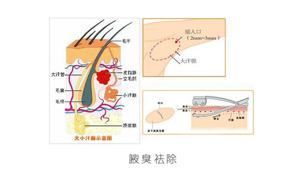 腋臭,就是“狐臭”,往往给人带来很多的不便。去腋臭手术指的是通过手术手段对腋臭进行治疗的方式,在腋下做一绿豆大小的切口,用汗腺清除器进入腋下皮肤,仔细将汗腺破坏并清除出体外,达到根治腋臭的目的。