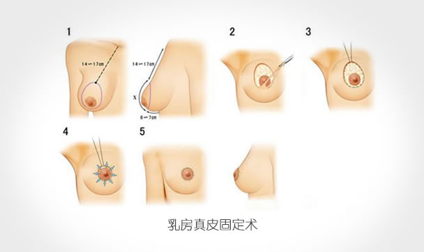 1、乳房真皮固定术:本术是治疗乳房松垂的可靠手术方法,适用于各型各类的乳房松垂。先于术前确定乳房应处的正常部位。基于乳房体积适当,但组织分布失常而发生松垂的原理,切除一部分乳房皮肤的表皮,露出真皮,然后利用缝合方法将真皮向乳房内部卷转填入,迫使乳头和乳房向上方移动并向前方凸出,以恢复正常形态。由于乳房有较强韧的真皮层以及真皮与真皮间的牢固愈合,经过重新塑形后的乳腺组织可以保持稳定而不致再发生乳房变形。